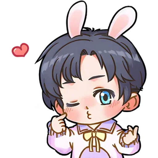 Menino de olhos azuis com orelhas de coelho, cabelo preto e expressão tímida, vestindo uma camisa rosa com um laço amarelo. Há um coração vermelho ao lado.