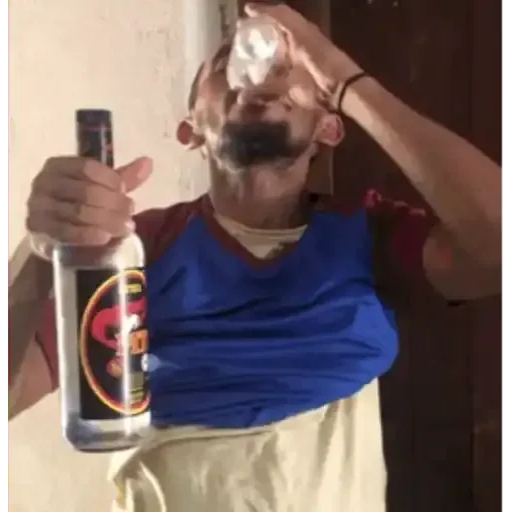 Homem com uma garrafa de bebida, fazendo careta e com um copo na mão.