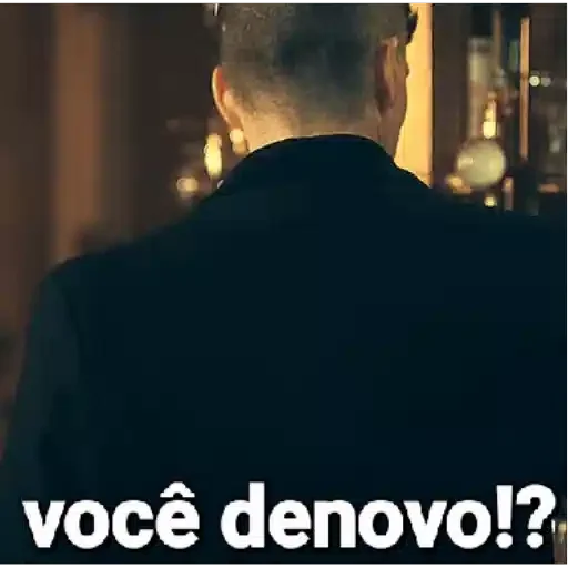 Um homem de costas, vestido de preto, com o texto 'você denovo!' em branco na parte inferior.