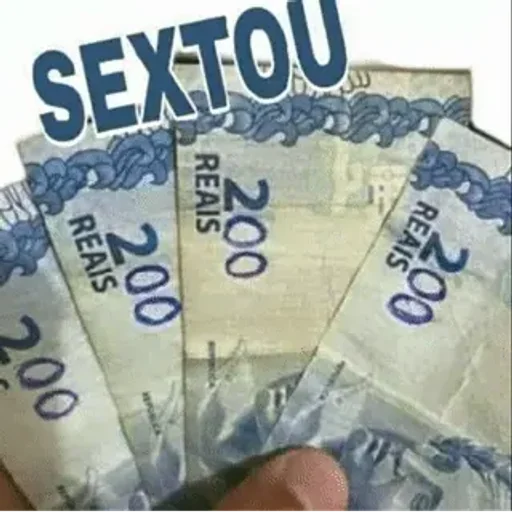Uma mão segurando notas de 200 reais com a palavra 'SEXTOU' em letras grandes azuis.