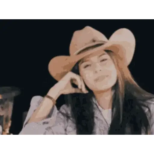 Uma mulher com chapéu de cowboy e cabelo longo, parecendo relaxada ou sonhando acordada.