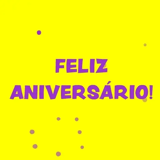 Um fundo amarelo brilhante com a mensagem 'FELIZ ANIVERSÁRIO!' em letras roxas grandes e pontos roxos espalhados ao redor.