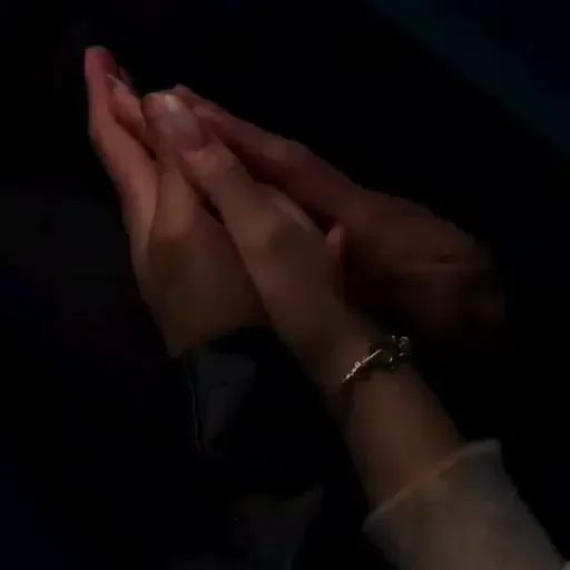 Mãos de uma pessoa com as palmas juntas, usando um bracelete, contra um fundo escuro.