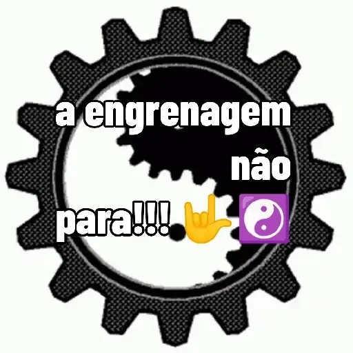 Uma engrenagem preta com texto branco que diz 'a engrenagem não para!!!' e um emoji de mão amarela e um yin-yang roxo.