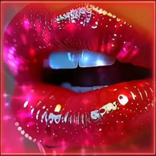 Lábios vermelhos com brilho e gloss, adornados com cristais ou pedras brilhantes. A boca está semi-aberta, mostrando dentes brancos.