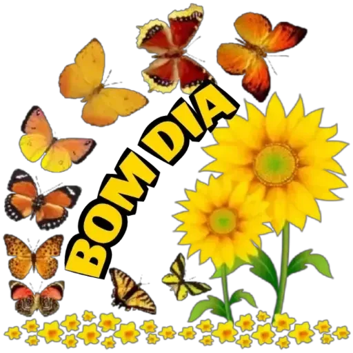 Um desenho de duas flores de girassol amarelas com borboletas coloridas ao redor e a frase 'BOM DIA' em letras grandes e amarelas.