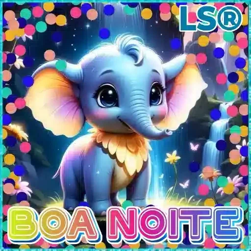 Um elefante azul com orelhas grandes e olhos grandes, com a frase 'BOA NOITE' em letras coloridas na parte inferior. O fundo tem estrelas e borboletas.