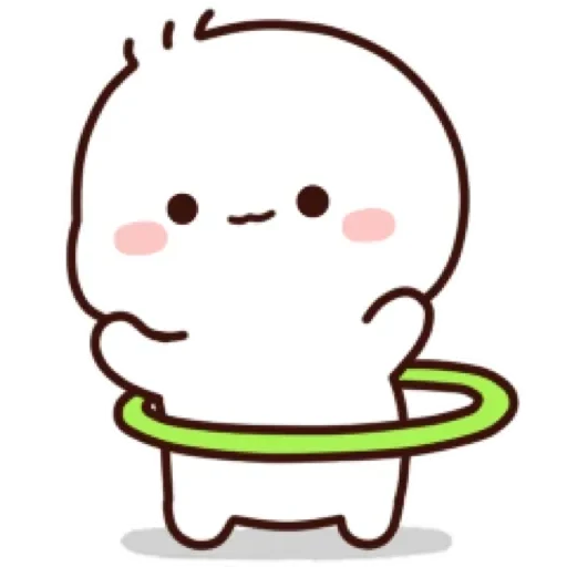Um personagem de desenho animado branco e redondo com bochechas rosadas e um aro verde em volta da cintura, fazendo uma expressão pensativa.