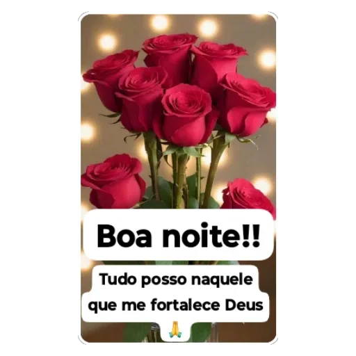 Um buquê de rosas vermelhas com luzes ao fundo e o texto "Boa noite!! Tudo posso naquele que me fortalece Deus"