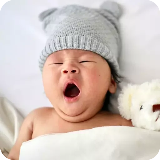 Um bebê recém-nascido com um gorro cinza de ursinho, bocejando com a boca aberta, ao lado de um ursinho de pelúcia branco.