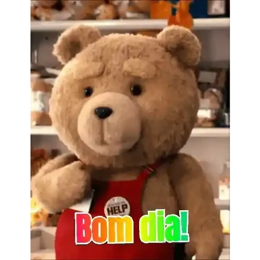 Um ursinho de pelúcia castanho com um avental vermelho e a frase 'HELP Bom dia!' sobreposto.