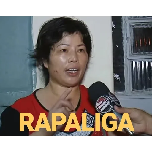 Uma mulher com cabelo preto e uma camiseta vermelha e preta fala ao microfone com a mão no queixo. A palavra 'RAPALIGA' está escrita em amarelo na parte inferior.