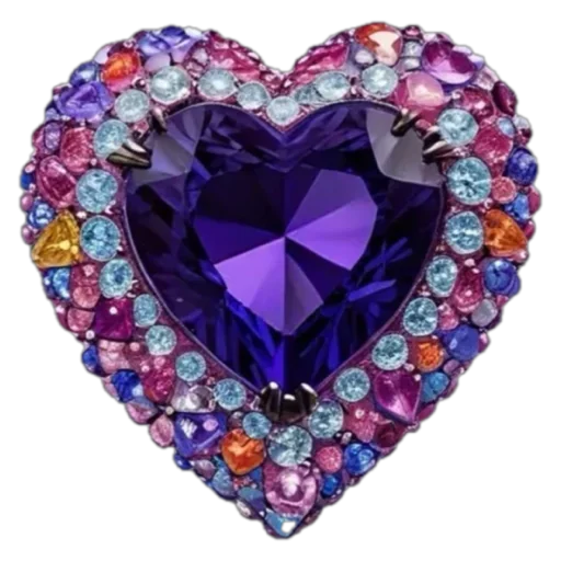 Um coração de pedra preciosa roxa cercado por pedras coloridas.