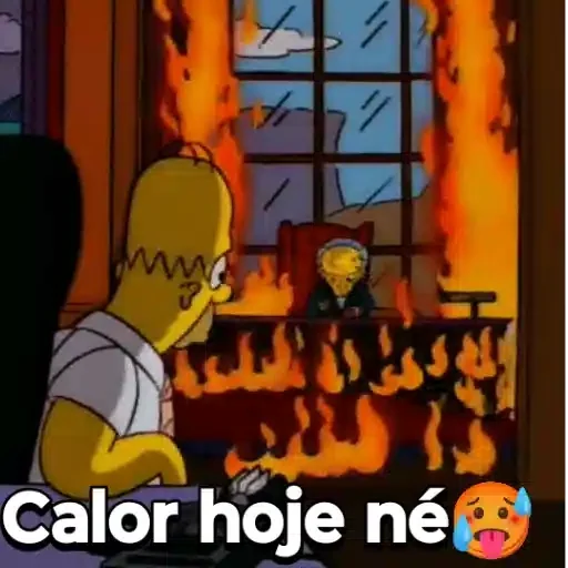 Homem de cabelos amarelos e sem cabelo em cima, de perfil, em frente a uma janela com fogo do lado de fora. Ele está usando uma camisa branca. Há um texto embaixo que diz 'Calor hoje né'.