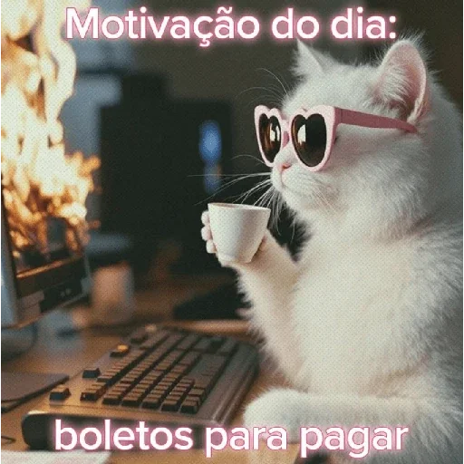 Gato branco usando óculos de sol e segurando uma xícara de café em frente a um computador, com texto 'Motivação do dia: boletos para pagar'.