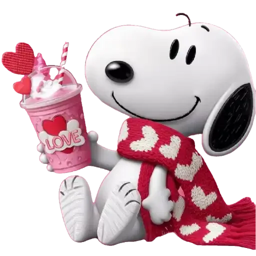 Snoopy, o cachorro branco do Peanuts, sorri enquanto segura um milkshake rosa com o texto 'LOVE' e decorado com corações vermelhos e uma tampa com um coração. Ele está usando um cobertor vermelho com corações brancos.