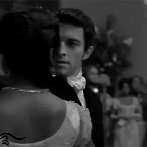 Cena de filme preto e branco com casal em destaque, homem de terno e mulher de vestido, ambos em ambiente formal.