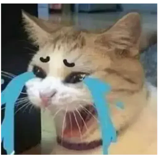 Gato com expressão engraçada e lágrimas azuis saindo dos olhos. O gato tem focinho branco e orelhas pontiagudas.