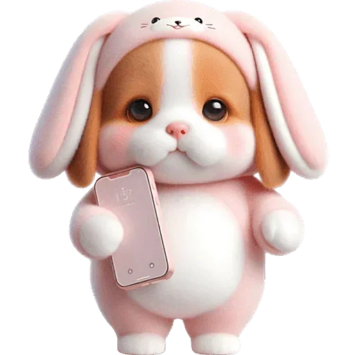 Um coelho fofinho com orelhas de coelho rosa, segurando um celular rosa.