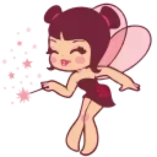 Uma fada cartoon com asas cor-de-rosa e cabelo roxo, vestindo uma roupa vermelha, sorrindo e fazendo um gesto mágico com sua varinha.