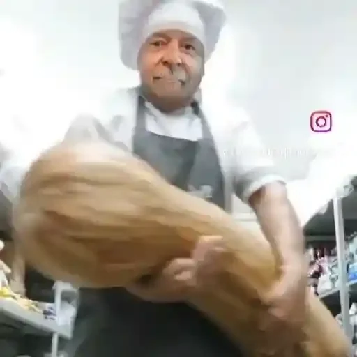 Um homem com touca de cozinheiro e avental cinza segura um grande pão.