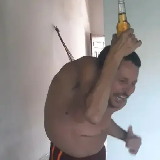 Homem sem camisa com uma garrafa de cerveja na mão, fazendo um gesto com a outra mão.