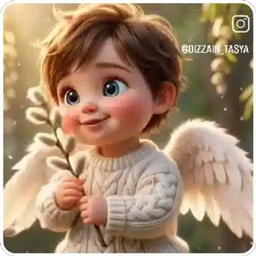 Menino anjo com asas brancas e cabelo castanho, segurando um galho, com um sorriso no rosto e olhos azuis brilhantes.