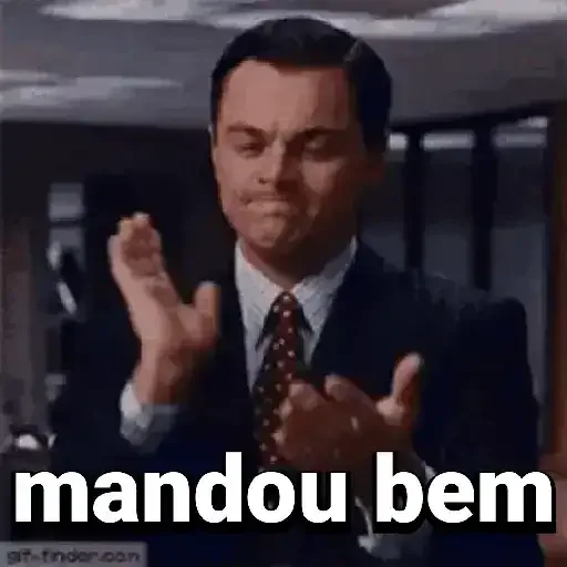 Homem de terno fazendo um gesto com as mãos e a frase 'mandou bem' em texto branco na parte inferior.