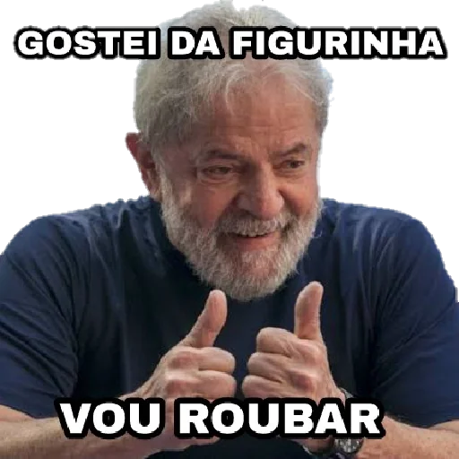 Um homem mais velho com cabelo grisalho e barba, vestindo uma camiseta azul, fazendo dois gestos de polegar para cima. Ele está sorrindo. A imagem tem o texto 'GOSTEI DA FIGURINHA VOU ROUBAR' sobreposto.