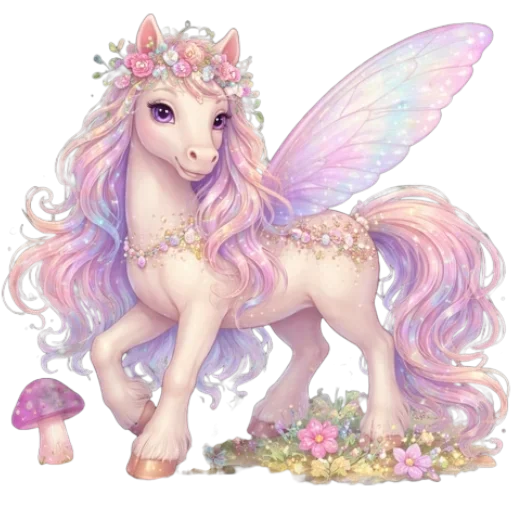 Um unicórnio com asas de borboleta, pelagem rosa e roxa, e uma coroa de flores na cabeça. Ele está em pé sobre flores e há um cogumelo ao lado.
