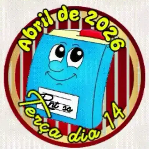 Um calendário azul com olhos e sorriso, fundo listrado vermelho e amarelo, texto 'Abril de 2026' e 'Faça dia 14'.
