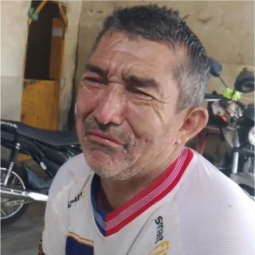 Um homem de meia-idade com expressão séria, vestindo uma camisa branca com gola vermelha e azul, e um logotipo colorido no peito.