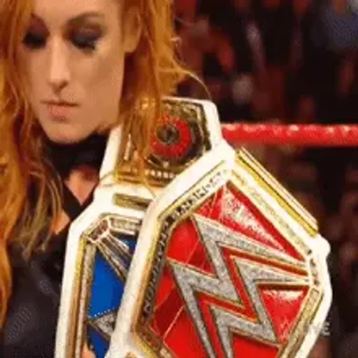 Mulher com cabelo ruivo e maquiagem pesada segurando um cinturão de campeonato de luta livre com placas vermelha e azul.