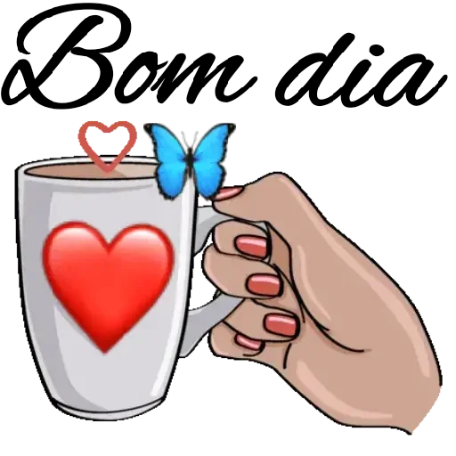 Uma mão segurando uma xícara de café com um coração vermelho e uma borboleta azul, com o texto 'Bom dia' em cima.
