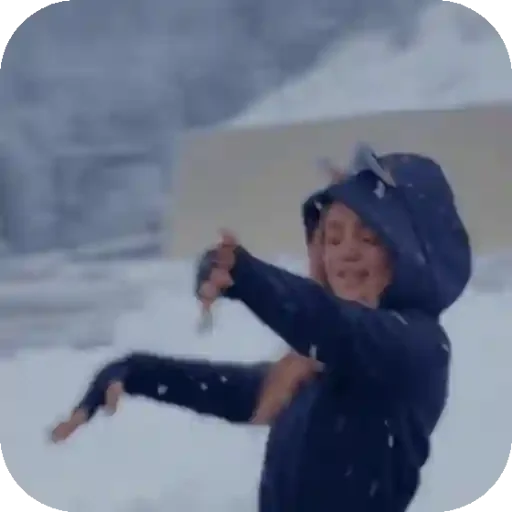 Menino de pé na neve, com um casaco escuro e capuz, jogando uma bola de neve com as duas mãos. Neve está caindo ao redor.