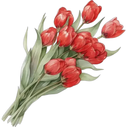 Um buquê de tulipas vermelhas com folhas verdes.