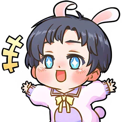 Personagem de anime com orelhas de coelho, cabelo preto e olhos azuis, usando um casaco roxo e amarelo com estrelas…