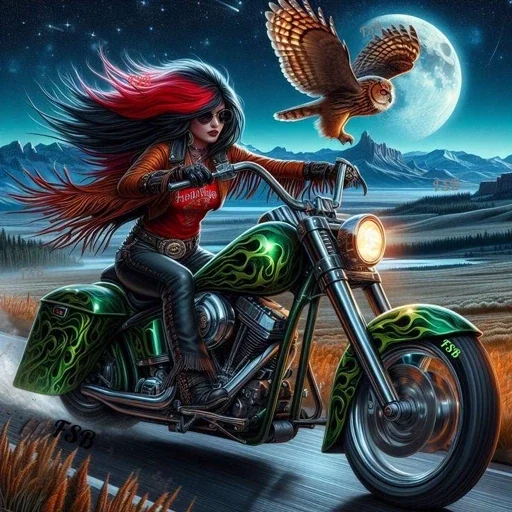 Mulher com cabelos longos e vermelhos anda de moto verde em uma estrada noturna sob a luz da lua cheia, com um pássaro marrom voando ao lado.