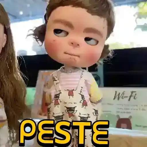 Boneco de brinquedo com expressão facial séria e roupa xadrez, ao lado de outro boneco com cabelo castanho. A palavra 'PESTE' aparece em destaque.