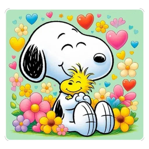 Snoopy e Woodstock sentados entre flores coloridas com corações e flores ao redor, ambos com expressões felizes.