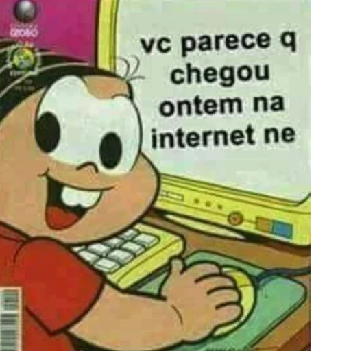 Menino de olhos grandes e boca aberta, com uma expressão surpresa, sentado em frente a um computador com o texto 'vc parece q chegou ontem na internet ne' na tela.