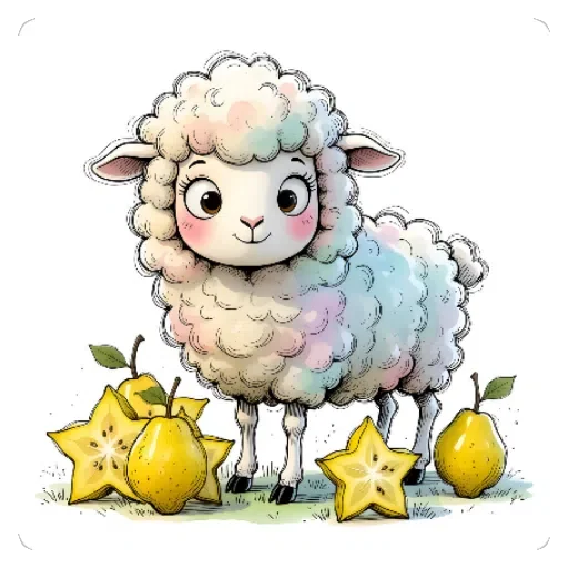 Um cordeiro fofinho com lã branca e rosa, ao lado de peras e estrelas amarelas.