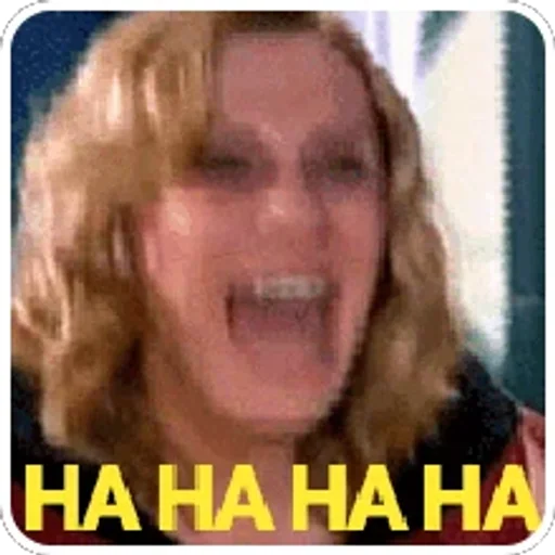Imagem de uma mulher loira com a boca aberta e expressão de riso, com o texto 'HA HA HA HA' em amarelo na parte inferior.