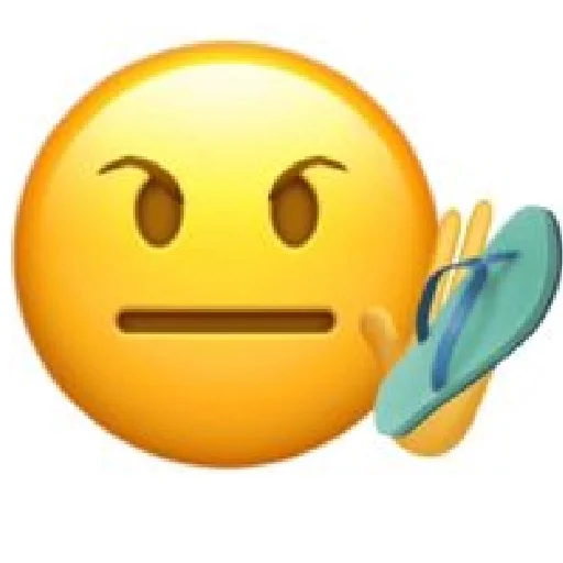 Um emoji de rosto amarelo com expressão de desaprovação ou desagrado, com uma mão segurando um chinelo verde ao lado.