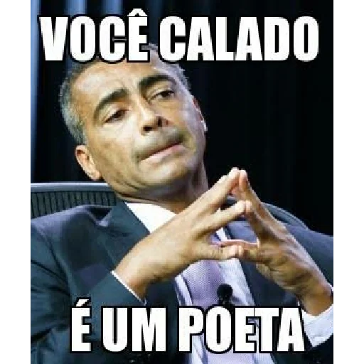 Homem de meia-idade com terno e gravata, mãos cruzadas e expressão pensativa, com texto "VOCÊ CALADO É UM POETA" em letras brancas.