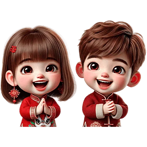 Dois personagens de anime infantil, um menino e uma menina, vestidos com roupas vermelhas tradicionais chinesas, com as mãos juntas em frente ao corpo e sorrindo.