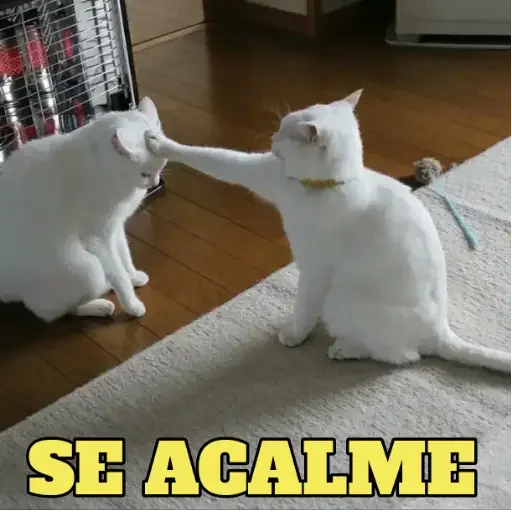 Dois gatos brancos, um acalmando o outro com a pata na frente do focinho. 'SE ACALME' em letras amarelas.