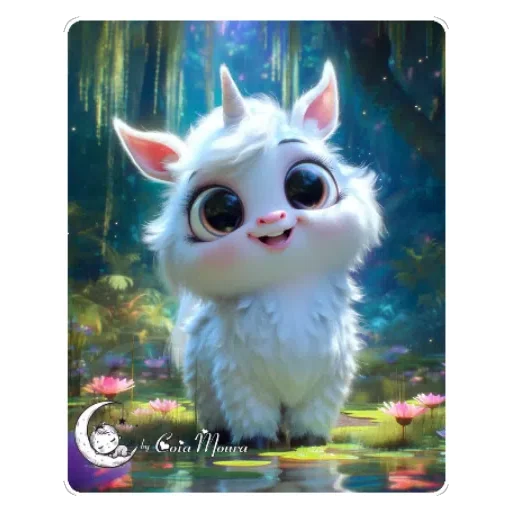 Um coelho branco fofinho com olhos grandes e orelhas pontiagudas, em um ambiente com flores e lua crescente.