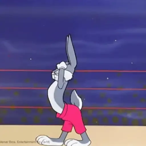 Um coelho cartoon de orelhas longas, vestindo shorts vermelhos, fazendo um movimento de alongamento ao pôr do sol com céu escuro.