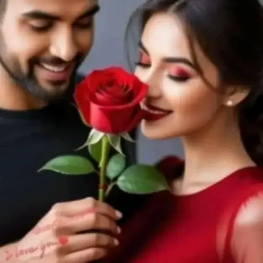 Um casal, com o homem ao lado esquerdo e a mulher à direita, ele sorri e segura uma rosa vermelha perto do rosto dela, que também sorri.